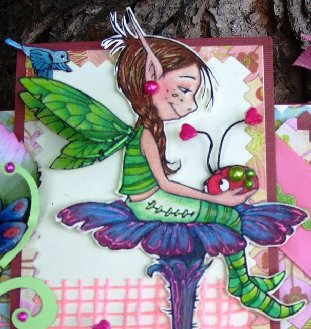 Aren't the Hippo's sunglasses cool? The eyes have Glossy Accents covering them so they pop out looking at you! Image colored with Prisma pencils; chip board flourishes to make the cage with black ribbon bars. I am very low on buttons so only button wheels and a red button at the top. Some stars sent by my good buddy. Since the theme said "Butterfly (singular) or Buttons," I did buttons and a dragonfly!